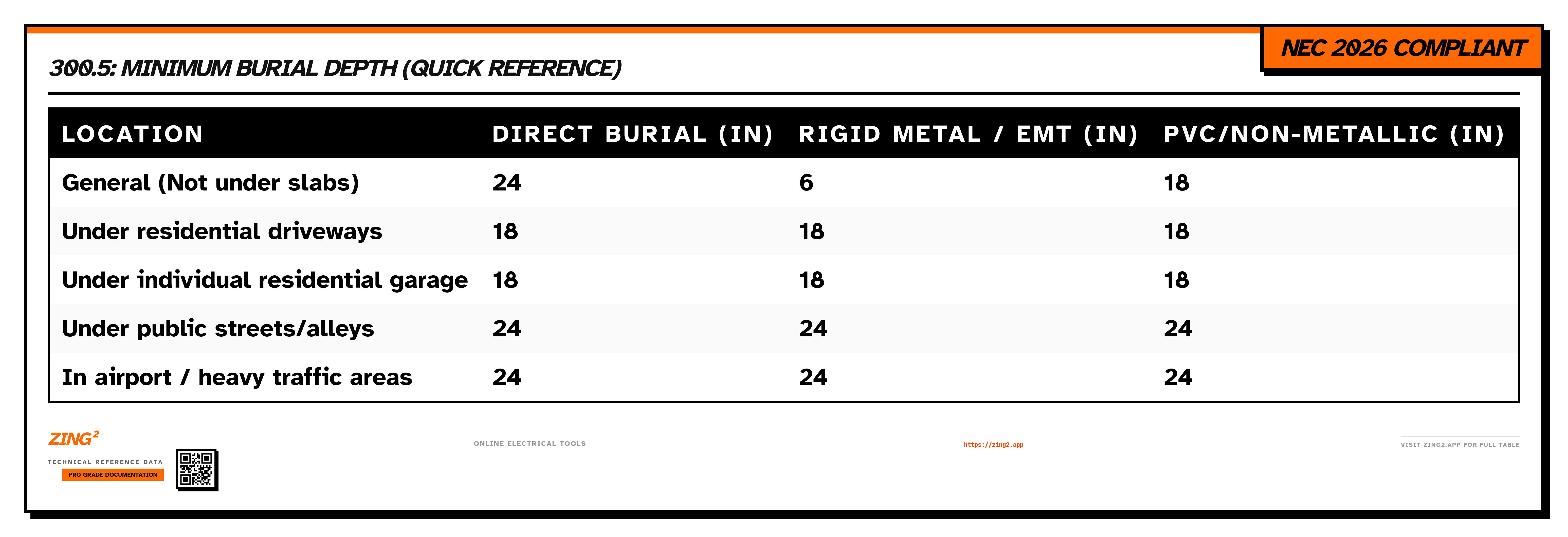 - ▸Residential Driveways: Requirements for 18 inches of cover apply to one- and two-family dwelling driveways. Public streets always require 24 inches regardless of wiring method.